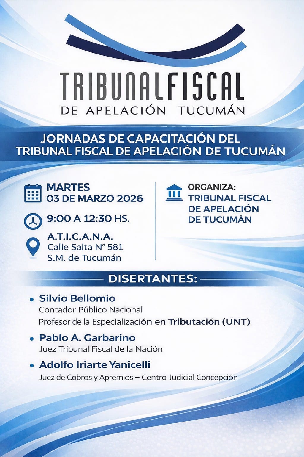 El día 03 de Marzo del corriente año  se desarrolló en la Sede Educativa A.T.I.C.A.N.A., ubicada en calle Salta 581, San Miguel de Tucumán, una “JORNADA DE CAPACITACION DEL TRIBUNAL FISCAL DE APELACION”.